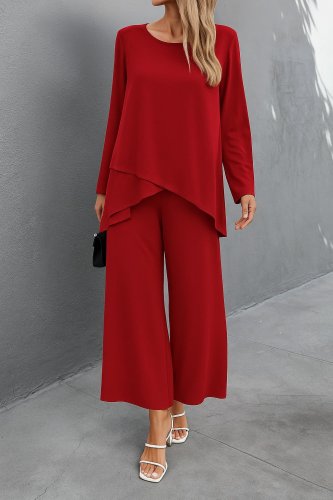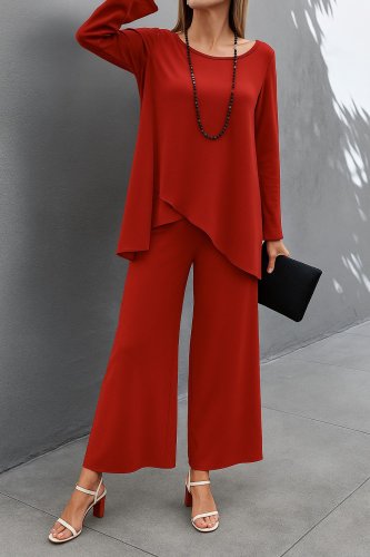 Dwuczęściowy damski, asymetryczny, swobodny komplet z bluzką i spodniami w kolorze piaskowym, z długim rękawem i detalami
