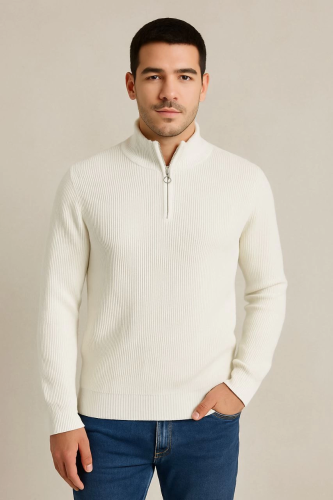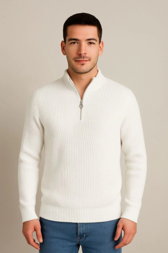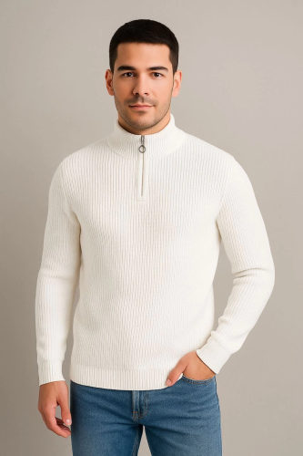 Męski sweter z dzianiny z zamkiem błyskawicznym do połowy – Selanik Knitting, stójka, tkana bawełna, regularny krój, długi rękaw, model zimowy – biały