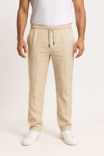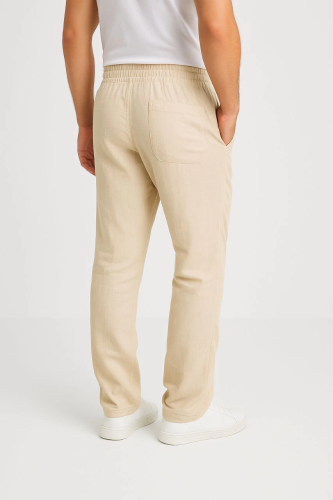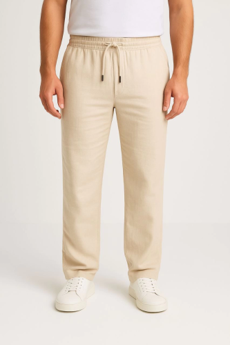 Męskie spodnie lniane – kieszenie, elastyczny pas i sznurowanie, oddychające, wygodne, do noszenia na co dzień latem i wiosną, stylowe i wygodne, proste nogawki – beżowe