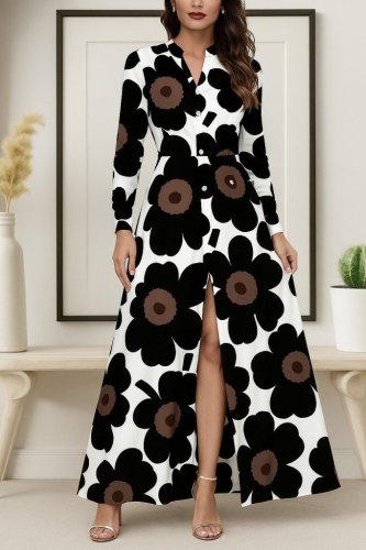 Damska długa sukienka z dzianiny jersey z kołnierzykiem i kwiatowym wzorem, zapinana z przodu na guziki