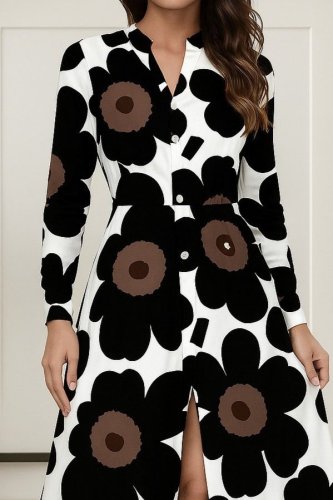 • Damska długa sukienka z dzianiny jersey z kołnierzykiem i kwiatowym wzorem, zapinana z przodu na guziki