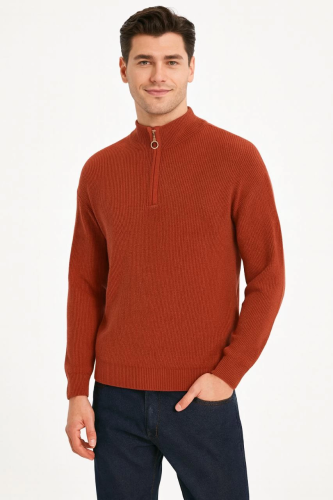 • Męski sweter z dzianiny z zamkiem błyskawicznym do połowy – dzianina Selanik, stójka, tkana bawełna, regularny krój, długi rękaw, model zimowy – cegła