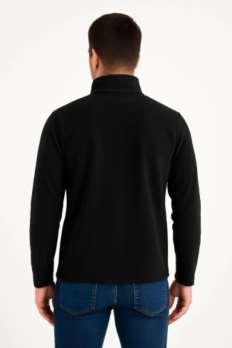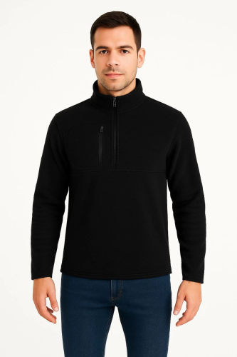 Męski sweter polarowy – kołnierz stójka, zamek błyskawiczny do połowy, kieszeń na piersi zapinana na zamek, czarne lamówki, wygodny, regularny krój, swobodny model na zimę – czarny