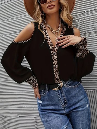 • Bluzka damska z odkrytymi ramionami, zapinana z przodu na guziki, zdobiona wzorem w panterkę, w kolorze piaskowym