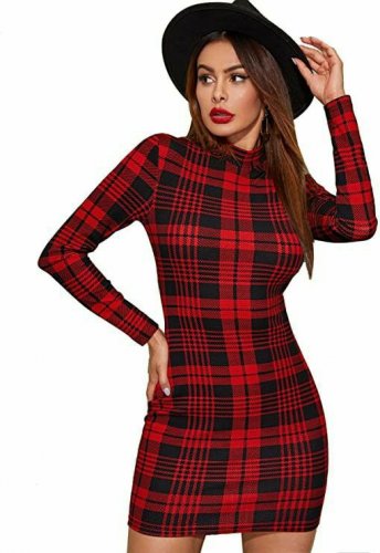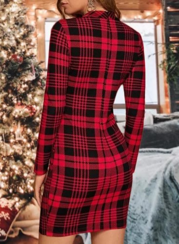 Damska sukienka mini do nurkowania z długim rękawem i półgolfem w kratę
