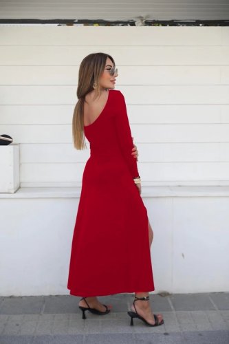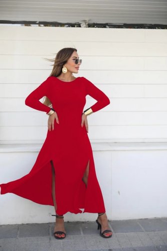 • Damska sukienka z wiskozy z długim rękawem, lekkim dekoltem w łódkę, odkrytymi plecami i rozcięciem