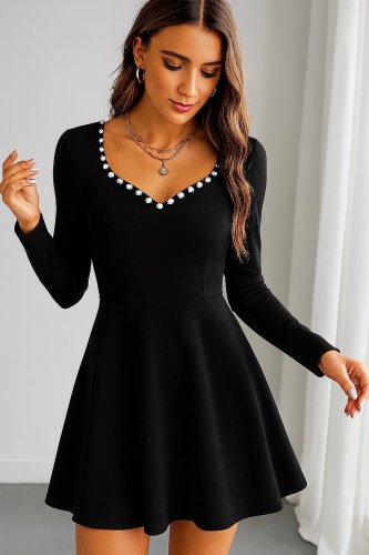 Damska sukienka z długim rękawem i perłowym kołnierzykiem, krótka, importowana, z krepy