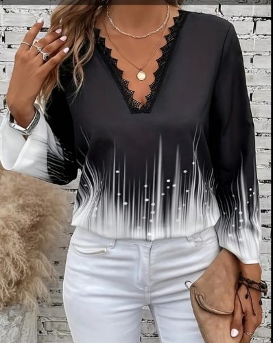 Damska bluzka z długim rękawem i koronkowym kołnierzykiem w serek, z wzorem modalu