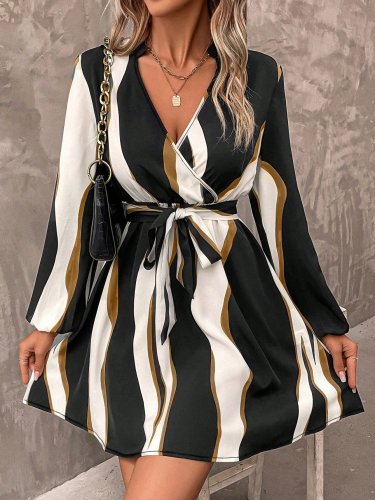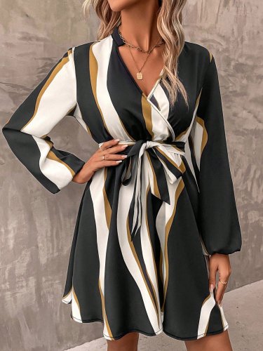 Damska sukienka mini z długim rękawem, dwurzędowa, wzorzysta, z modalu