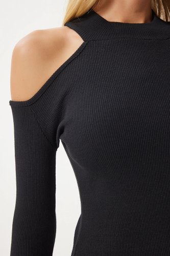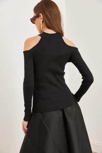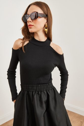 • Damska bluzka z długim rękawem i odkrytymi ramionami, wykonana z materiału typu halter