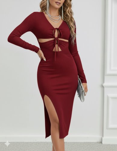 • Damska sukienka midi w kolorze piaskowym z długim rękawem i dekoltem na wysokości klatki piersiowej