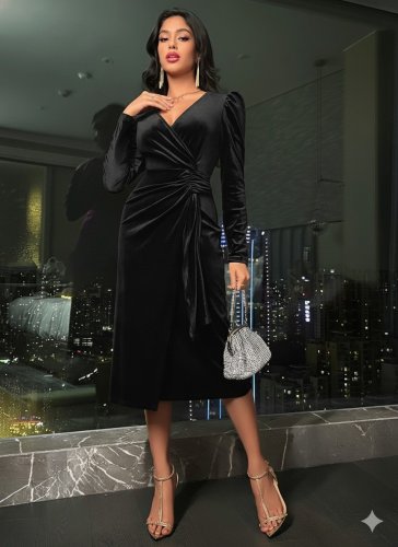 • Damska sukienka midi z aksamitu, dwurzędowa, z długim rękawem i marszczeniami po bokach