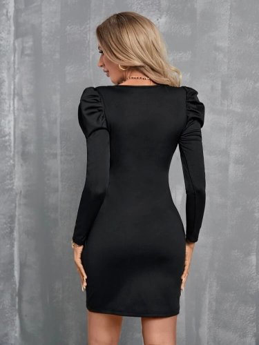 Damska sukienka mini z długim rękawem, dwurzędowym kołnierzykiem i ozdobnymi rękawami, wykonana z importowanej krepy