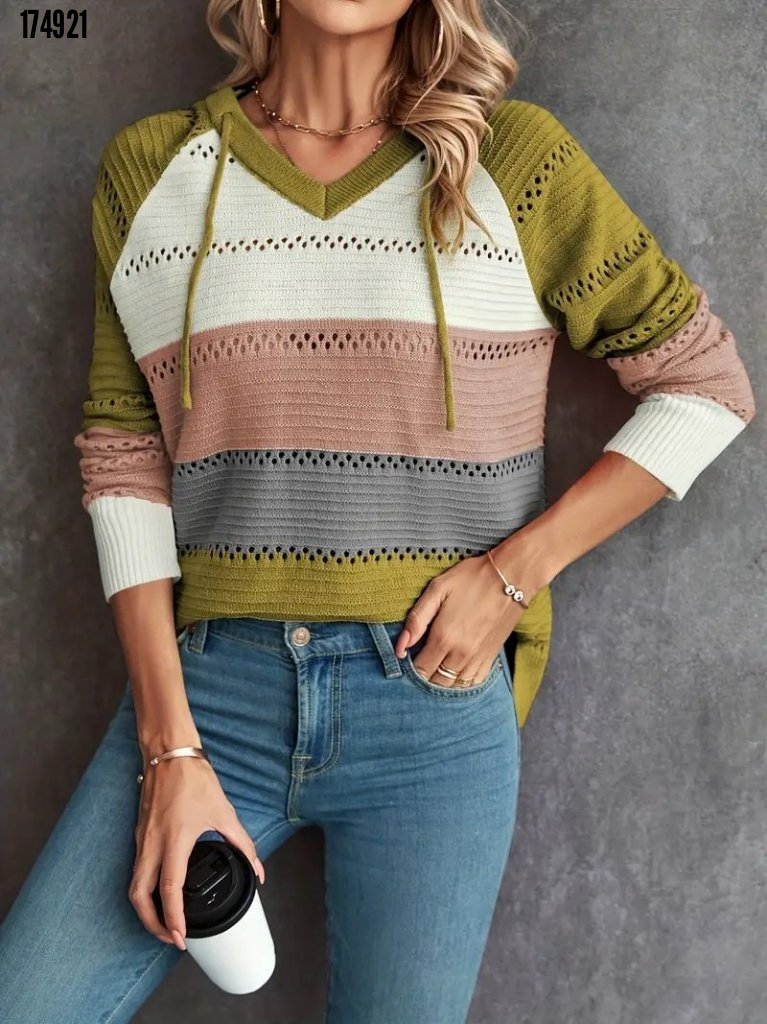 • Damska bluzka dzianinowa z długim rękawem i dekoltem w serek, sznurowana, z kapturem