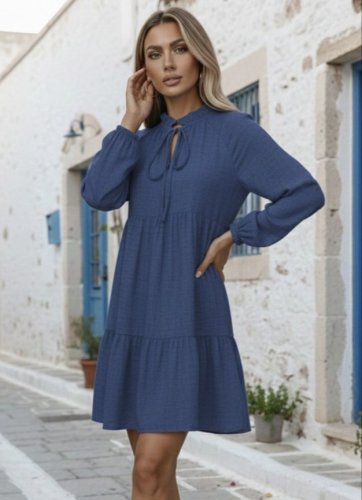 • Damska lniana sukienka mini z długim rękawem, sznurowana, z falbankami