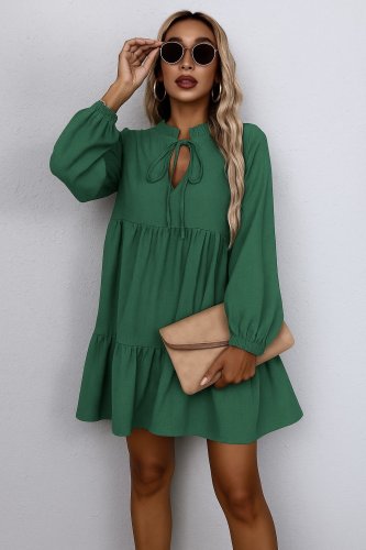 • Lniana sukienka mini z długim rękawem i falbanką przy szyi