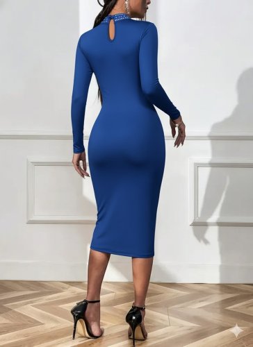 Damska sukienka midi z długim rękawem i golfem, wykonana z importowanej krepy, z ozdobnymi kamieniami