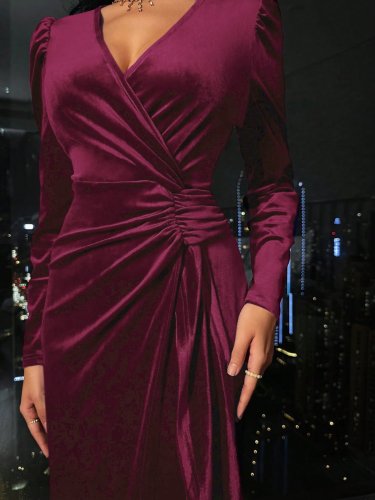• Damska sukienka midi z aksamitu, dwurzędowa, z długim rękawem i marszczeniami po bokach