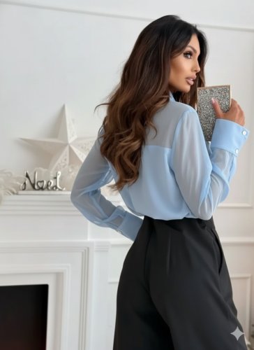 Damska bluzka z długim rękawem, kołnierzykiem, zapinana na guziki, wykonana z tiulu i tkanej wiskozy