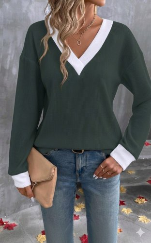 • Bluzka damska z długim rękawem i dekoltem w serek, waflowa