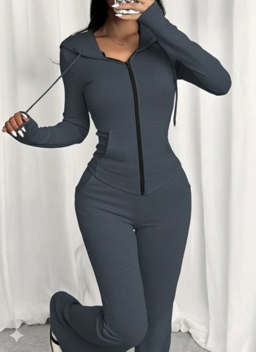Damski dwuczęściowy komplet z bluzką i spodniami z wiskozy z długim rękawem, kapturem i sznurowaniem, zapinany na suwak z przodu