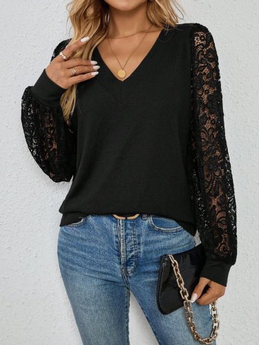 Bluzka damska z długim rękawem i dekoltem w serek, koronkowa, wiskozowa, dwunitkowa