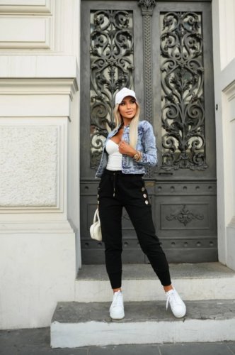 • Damskie spodnie z wiskozy dwunitkowej z wysokim stanem i elastycznym zapięciem na guziki boczne