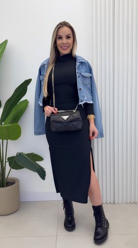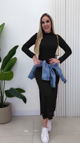 • Damska sukienka maxi z długim rękawem i golfem, z rozcięciem na boku