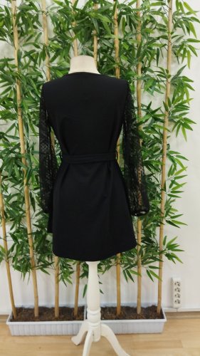 • Damska sukienka z długim rękawem, importowana z krepy, wiązana na szyi i z paskiem w talii