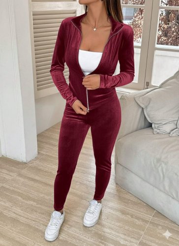 • Dwuczęściowy komplet damski z długim rękawem, bluzką i spodniami z aksamitu, zapinany z przodu na suwak
