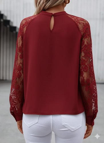 • Bluzka damska z długim koronkowym rękawem i okrągłym dekoltem w kolorze piaskowym
