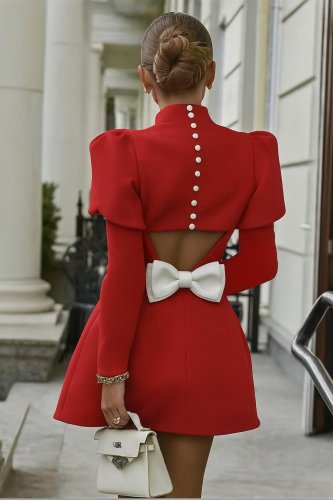 • Damska satynowa sukienka mini z długim rękawem i półgolfem, ozdobiona wstążką z tyłu