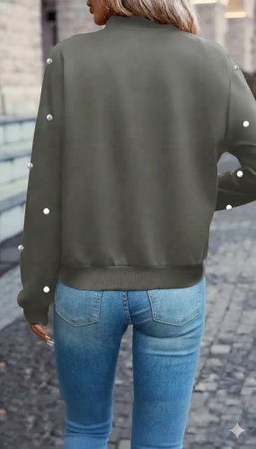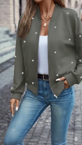 Damska kurtka z długim rękawem i krótkim zamkiem błyskawicznym z przodu, wykonana z materiału typu perłowego