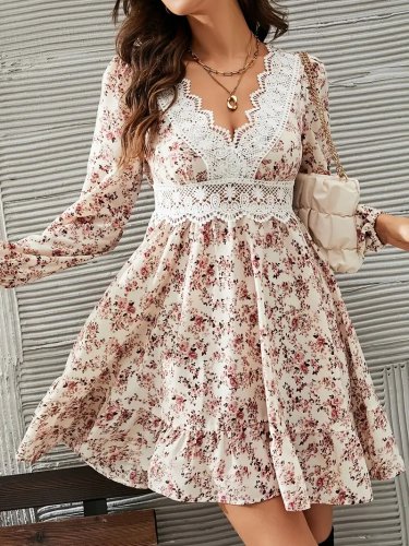 Damska sukienka mini z długim rękawem i koronkowym dekoltem w serek, wykonana z jerseyu we wzory