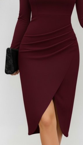 • Damska sukienka midi z długim rękawem i dekoltem w kształcie serca, z importowanej krepy, z ozdobnymi krzyżykami z przodu