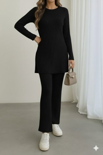 • Dwuczęściowy damski komplet z długim rękawem, okrągłym dekoltem i rozcięciem na boku, bluzką na ramiączkach i spodniami