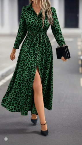 • Damska sukienka z długim rękawem i kołnierzykiem, z paskiem w talii i nadrukiem w panterkę, wykonana z modalu