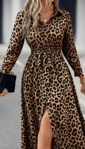 • Damska sukienka z długim rękawem i kołnierzykiem, z paskiem w talii i nadrukiem w panterkę, wykonana z modalu