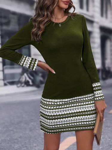 Sukienka damska z długim rękawem i okrągłym dekoltem, z nadrukiem dwunitkowym na mankietach i dole