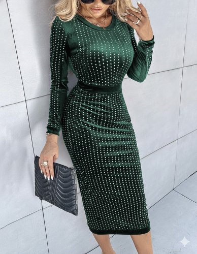 • Damska sukienka midi z długim rękawem i okrągłym dekoltem z aksamitu w kolorze kamienia