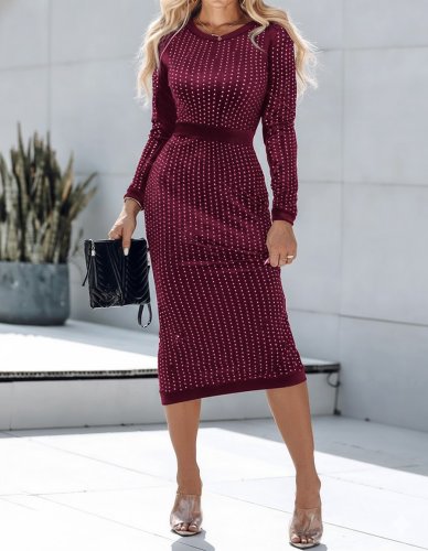 Damska sukienka midi z długim rękawem i okrągłym dekoltem z aksamitu w kolorze kamienia