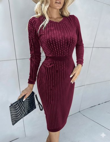 • Damska sukienka midi z długim rękawem i okrągłym dekoltem z aksamitu w kolorze kamienia
