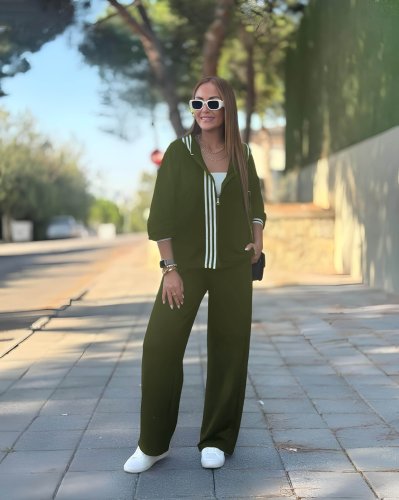• Damski dwuczęściowy komplet z bluzką i spodniami z wiskozy z długim rękawem i kapturem, zapinany na suwak, z detalami w paski