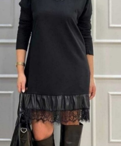 • Damska sukienka midi z długim rękawem i okrągłym dekoltem, ze skóry, koronki, wiskozy, dwuniciowej