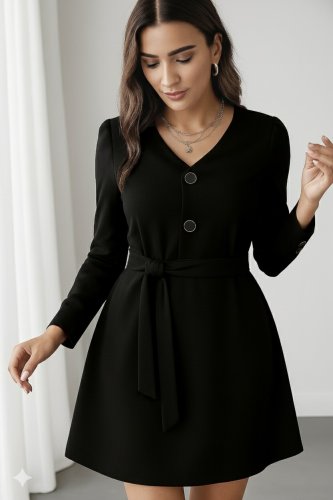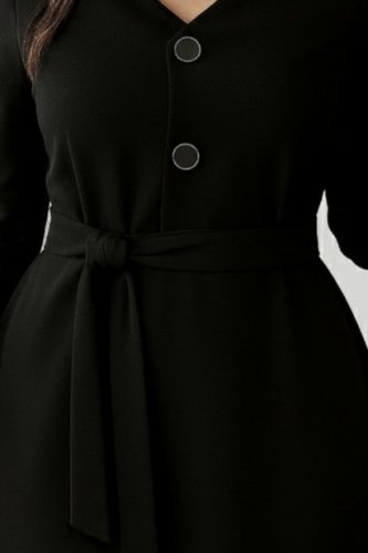 • Damska sukienka z długim rękawem, zapinana na guziki, z ozdobnym paskiem, importowana z krepy