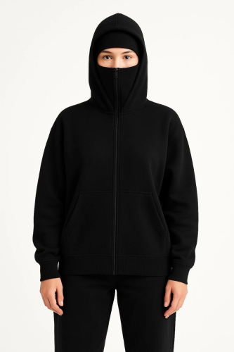 Bluza z kapturem Samurai Ninja z podwójnym kapturem i kieszenią kangurkową, zapinana na suwak i ozdobiona maską – czarna