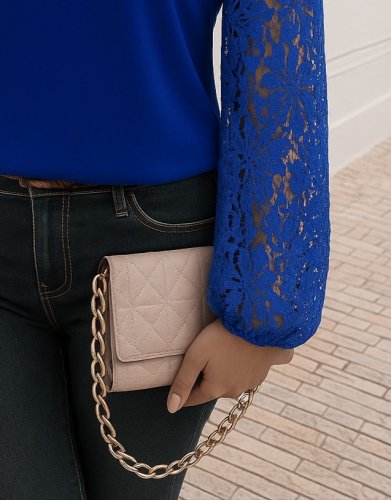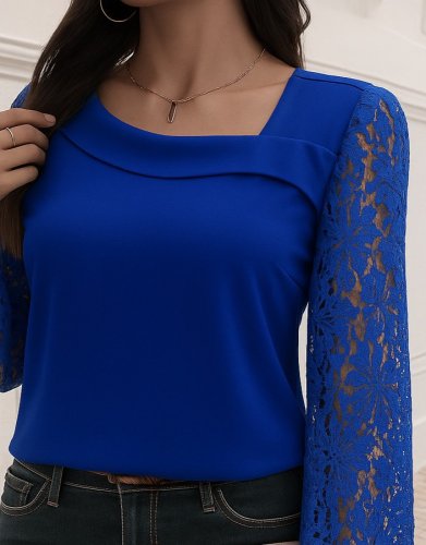• Bluzka damska z długim rękawem i asymetrycznym kołnierzykiem, wykonana z importowanej koronki i krepy