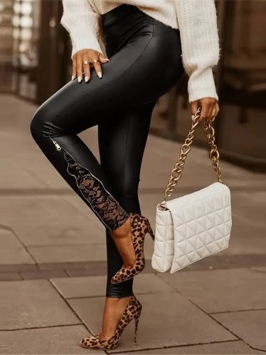 Damskie skórzane legginsy z wysokim stanem i rozcięciami po bokach, zdobione koronką