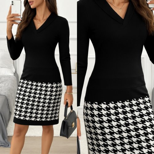 • Damska sukienka mini z długim rękawem i dekoltem w serek, z wzorem do nurkowania