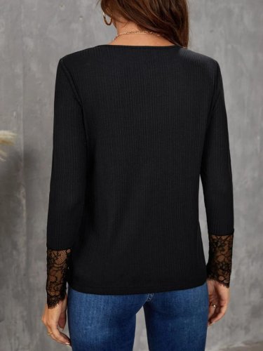 • Bluzka damska z długim rękawem i okrągłym dekoltem w kolorze bordowym, zdobiona koronką